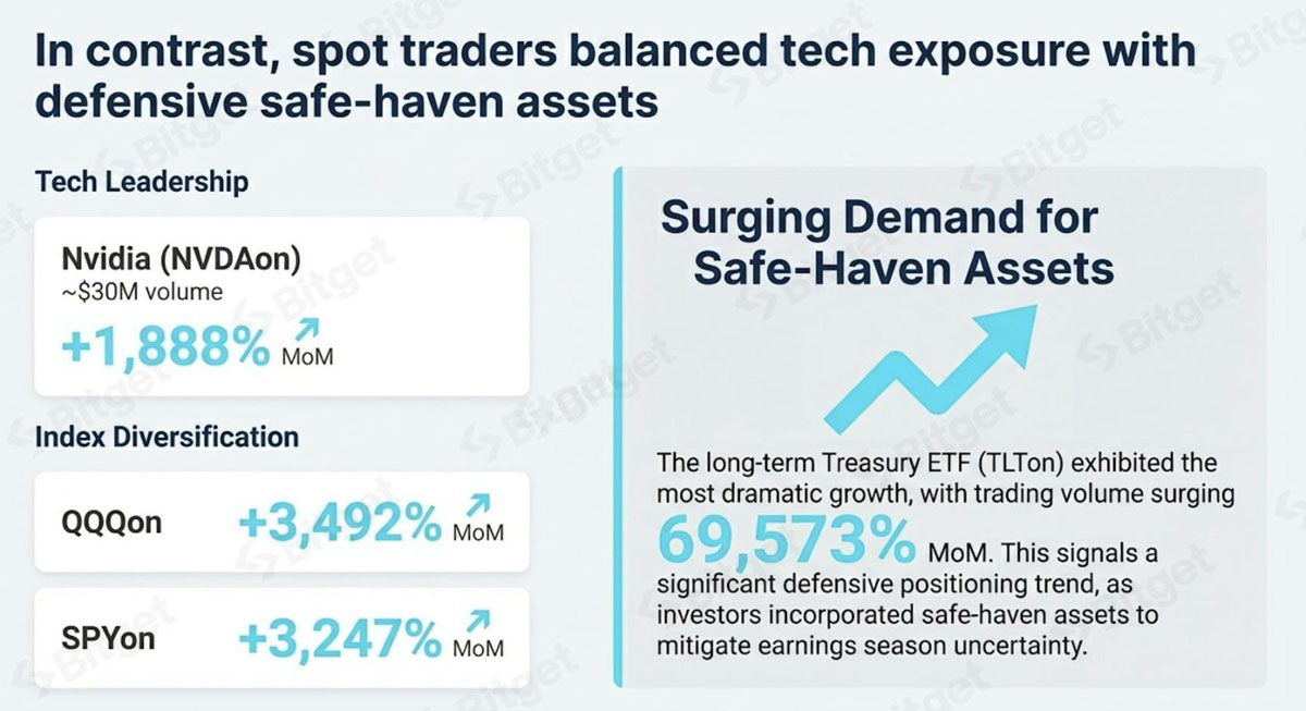 bitget 内部数据显示,在近期财报季(十月中旬至十一月末)期间,代币化美股交易活动出现显著激增。这一时期市场参与度异常高涨,需求激增幅度创纪录的 450%。增长势头遍布现货和合约市场,环比成交量分别增长 452% 和 4,468%。