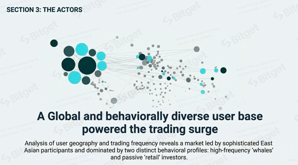 对用户地域分布与交易频率的分析显示,这是一个兼具全球多样性且按行为分层的市场。本轮交易活跃度的飙升由来自东亚的成熟投资者主导,并呈现出两种截然不同的交易画像:高频交易的「大户」和相对被动的「散户」投资者。