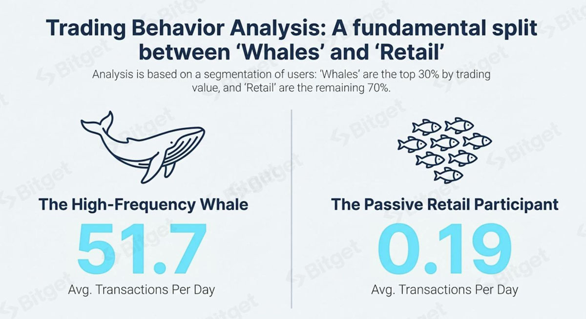 基于交易价值对用户进行划分,将交易额排名前 30% 的定义为「大户」,其余 70% 为「散户」。对他们的分析揭示了市场中最高活跃度与最低活跃度参与者之间存在的根本性行为差异。