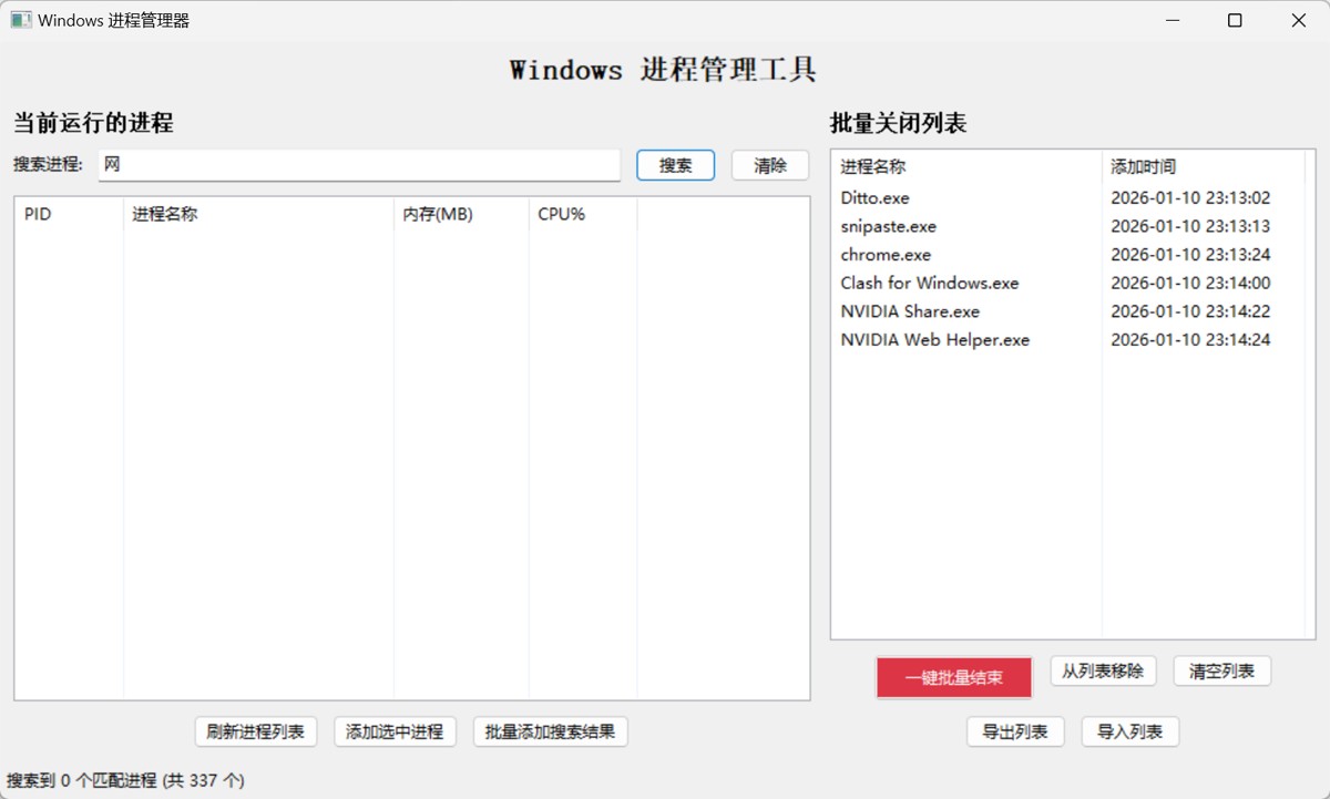 - 批量管理模块:管理待关闭进程列表