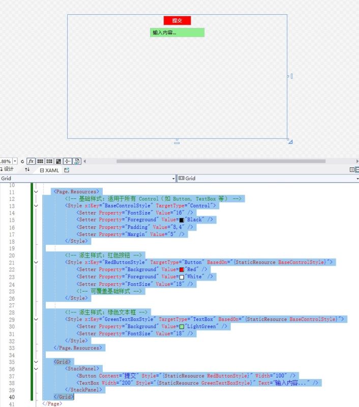 为解决上述“重复代码”问题,wpf 提供了 样式继承 机制,通过 basedon 属性实现样式的层次化定义。这样可以避免为每个控件重复设置相同的属性。