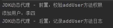 adduser方法:这是代理的核心逻辑。先执行前置增强(权限校验),再通过target.adduser(username)调用目标对象的核心业务方法,最后执行后置增强(日志记录)——用户调用的是代理类的方法,全程不直接接触目标对象,实现了对目标对象的控制。