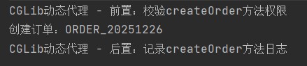 普通类,无任何接口,核心业务逻辑是createorder方法。注意:该类和方法不能是final——cglib是通过继承实现代理的,final类无法被继承,final方法无法被重写,会导致代理失败。这是cglib的核心限制。