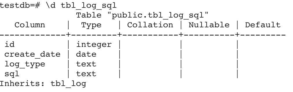 create table tbl_log( id int4, create_date date, log_type text ); create table tbl_log_sql( sql text ) inherits(tbl_log);