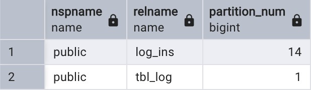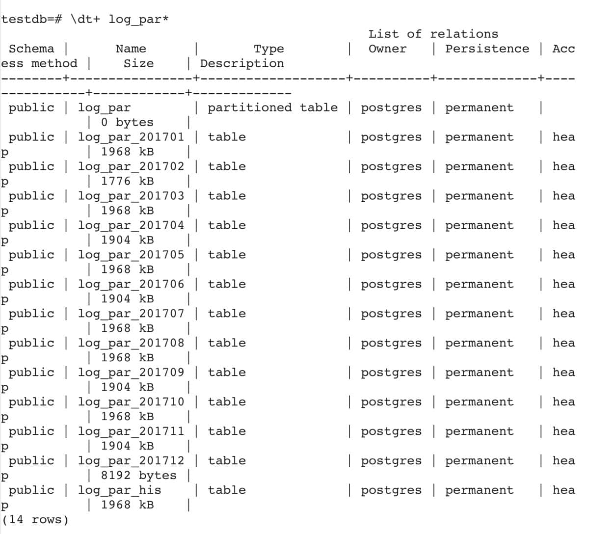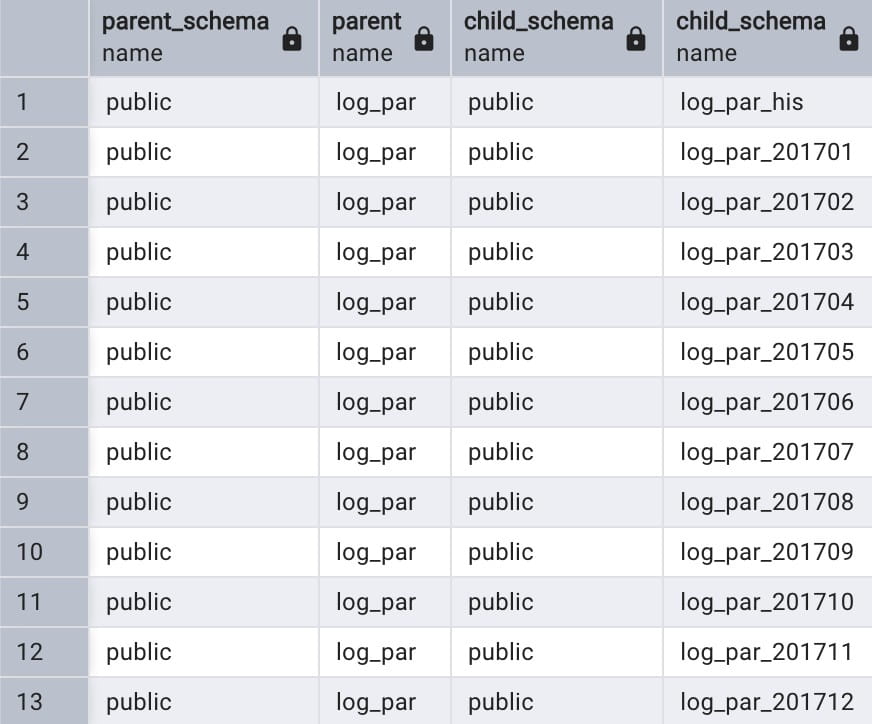 内置分区表原理实际上和传统分区表一样,也是使用继承方式,分区可称为子表,通过以下查询很明显看出表log par和其分区是继承关系: