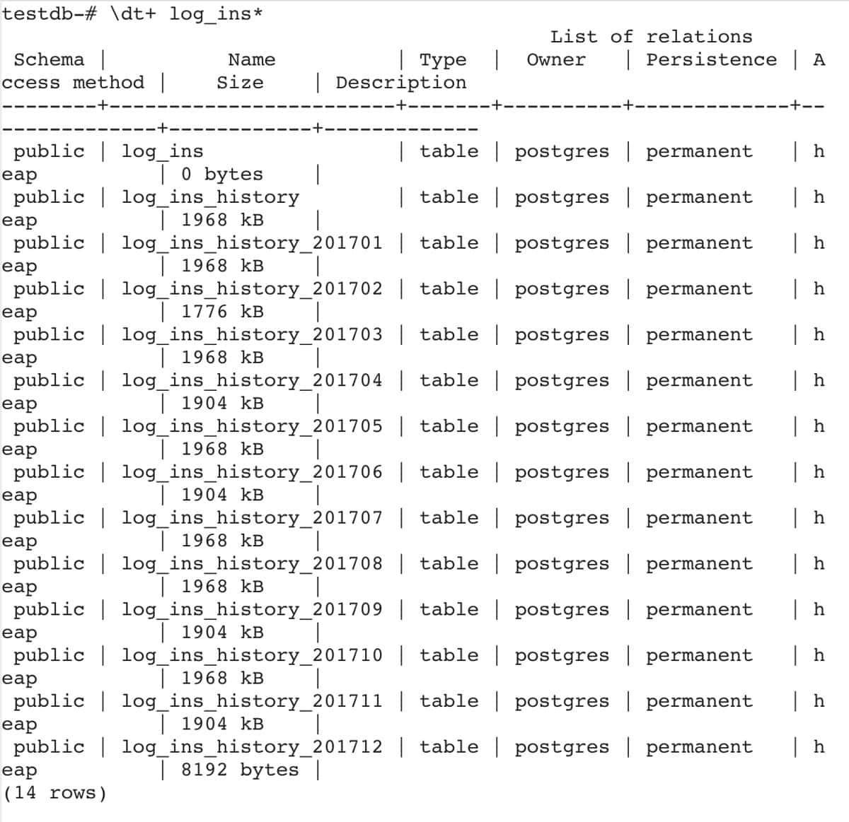 create table log_ins_history_201801( check(create_time >= '2018-01-01' and create_time < '2018-02-01') ) inherits(log_ins);