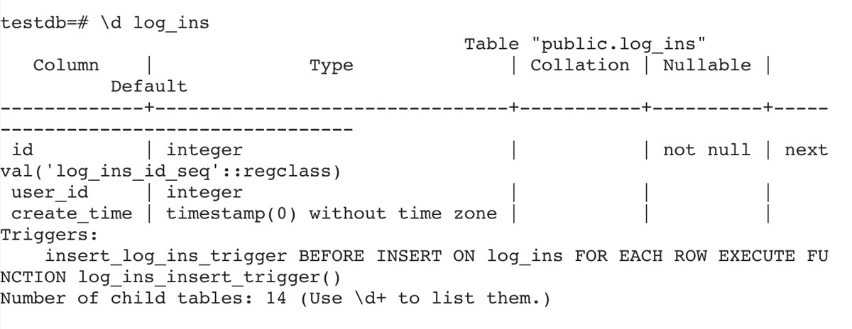 以上信息显示了表 log_ ins有 14 个分区,并且创 建了触发器 ,触发器函数为 log_ins_insert_ trigger (),如 果想列出分区名称可通过\d+ log_ins 元命令列出 。