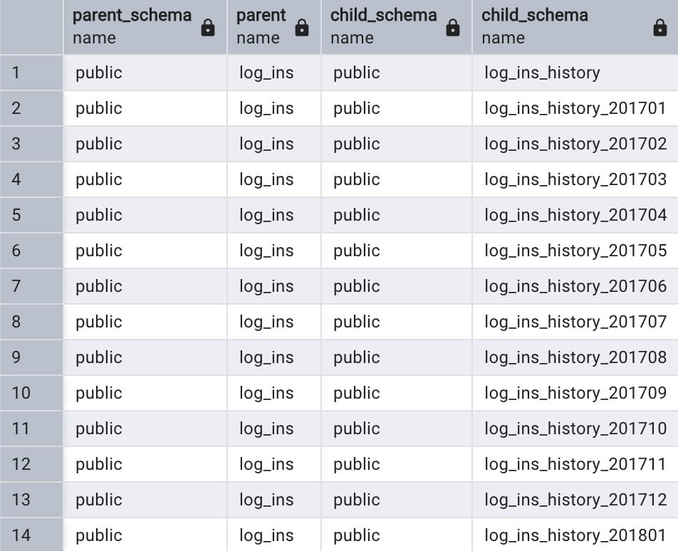 select nmsp_parent.nspname as parent_schema, parent.relname as parent, nmsp_child.nspname as child_schema, child.relname as child_schema from pg_inherits join pg_class parent on pg_inherits.inhparent = parent.oid join pg_class child on pg_inherits.inhrelid = child.oid join pg_namespace nmsp_parent on nmsp_parent.oid = parent.relnamespace join pg_namespace nmsp_child on nmsp_child.oid = child.relnamespace where parent.relname = 'log_ins';