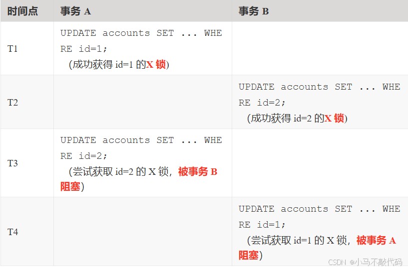 这个流程是理想状态下的。但当多个事务并发执行且锁的获取顺序出现环状依赖时,死锁就发生了。