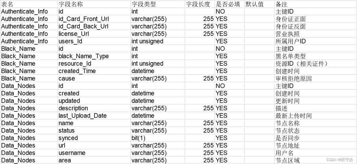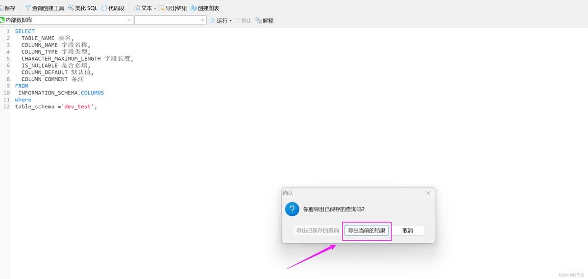 select table_name 表名, column_name 字段名称, column_type 字段类型, character_maximum_length 字段长度, is_nullable 是否必填, column_default 默认值, column_comment 备注 from information_schema.columns where table_schema ='dev_test';