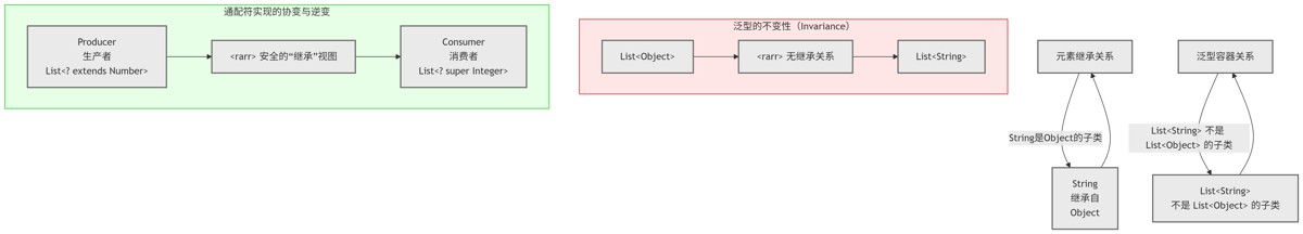 list<integer>不是list<number>的子类,但你可以通过上界通配符list<? extends number>来获得一个“只读”的、安全的“继承”视图。一个arraylist<integer>可以被当作一个list<? extends number>来使用。这模拟了协变(子类容器可以被视为父类容器)。逆变 (contravariance - 通过 ? super 实现,绿色部分):同样,你可以通过下界通配符