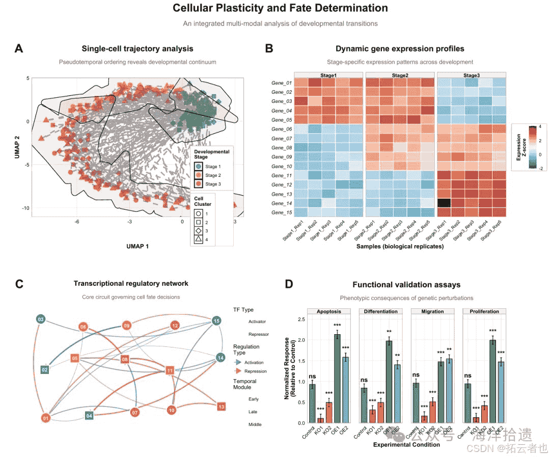 caption = '**fig. 1 |** single-cell trajectory analysis reveals developmental continuum (a). \ndynamic gene expression profiles show stage-specific patterns (b). \ncore transcriptional network regulates cell fate decisions (c). \nfunctional validation confirms phenotypic consequences of genetic perturbations (d).',