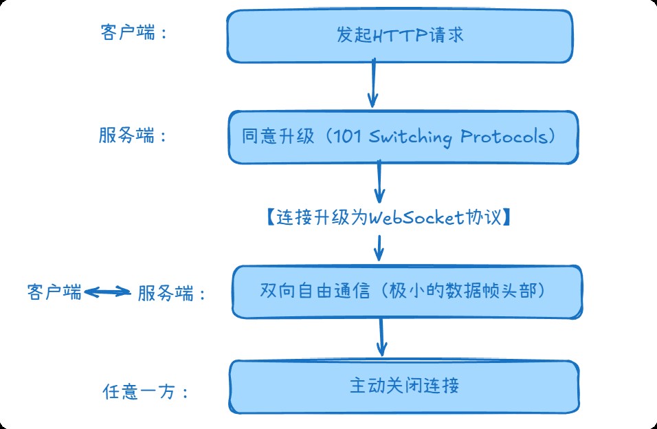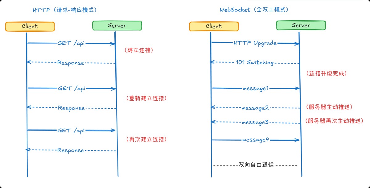 在传统的 web 应用中,客户端(浏览器)与服务器之间的通信是 请求-响应 模式:客户端发起请求,服务器处理后返回结果。这种模式适用于大多数场景,但在需要 实时双向通信 的场景下(如聊天室、股票行情、在线协作、游戏等),频繁轮询(polling)或长轮询(long polling)会带来高延迟、高开销的问题。