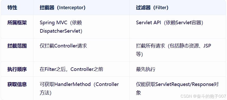 其核心作用是在不修改业务代码的前提下,对请求进行统一处理,类似于servlet中的filter,但更贴近spring mvc的体系。
