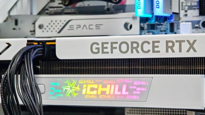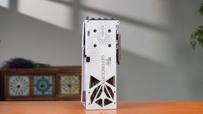 显卡在pcb一侧将金属背板进行弯折覆盖,提供更好的抗弯保护。侧面还配备了单个8-pin供电接口,以及下部ichill元素灯箱与控制按键,延续ichill系列的光效潮流。
