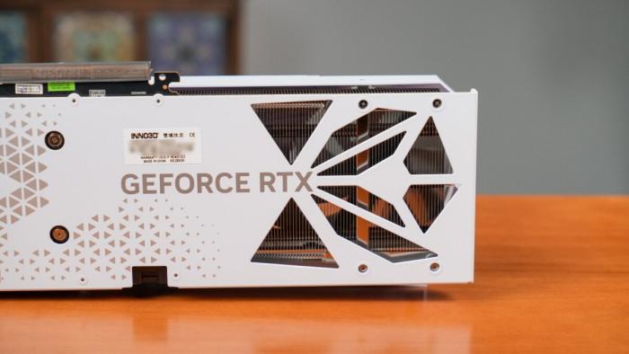 显卡背面同样采用高端系列一贯的全金属背板,为pcb元件与散热模组提供良好保护。延续“冰龙”系列标志性三角纹路、ichill logo与三角形背板镂空元素,为显卡尾部风扇让出风道形成吹透设计,进一步强化散热性能。