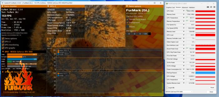 测试结果可见,显卡单烤功耗稳定在155w,平均核心频率为2482.4mhz,核心与显存平均温度分别为60.8℃与57.5℃,同时风扇转速仅为1500rpm,3风扇3槽体型为这款甜品显卡带来了许多散热余量。