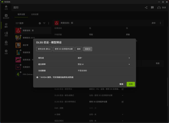 随后在app“图形”选项卡中选择“程序设置-具体游戏-dlss优设-模型预设”,选择“自定义”并将超分辨率选项设为“预设m”或“预设l”,其中预设m专为dlss性能模式优化,预设l专为dlss超级性能模式优化,因此玩家务必准确选择。