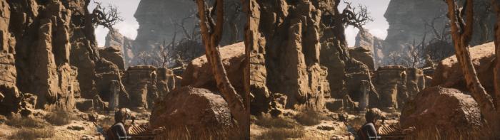 我们在《黑神话:悟空》中同一场景对新老模型的画面效果进行了对比,其中左侧为新模型-预设m,使用dlss性能档位,右侧为老模型-预设k,使用dlss质量档位,其它画质与分辨率设置保持一致。新模型与dlss性能档位能够以更低性能开销实现更高帧数,同时保持与老模型+dlss质量档位相似的边缘锐度、纹理细节、光影品质等画质水平,已经能够带来实质的体验提升。