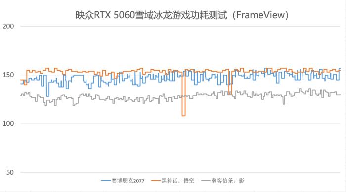 经过统计,映众rtx 5060雪域冰龙显卡在《赛博朋克2077》中的平均功耗为144.4w,在《黑神话:悟空》中平均功耗为153.1w,在《刺客信条:影》中平均功耗为128.3w。作为“超频版”显卡相比普通rtx 5060并没有产生太多额外能耗,依然拥有出色能效表现。