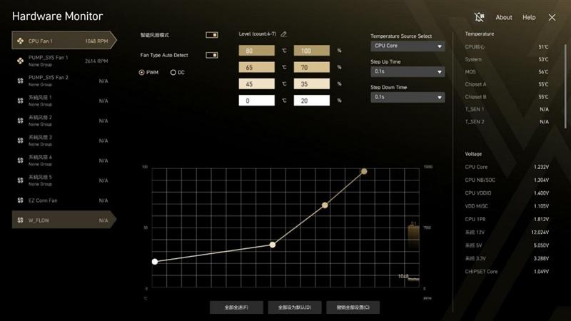 主板集成了1个4pin cpu风扇、2个水冷4pin、5个4pin机箱风扇接口。8个风扇都可以单独依据cpu、mos、主板或者机箱内部温度来设置温度曲线。