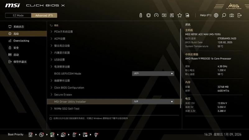 按f7进入高级模式,这里提供了cpu、芯片组、电源、存储、网络、usb接口等主板绝大多数部件的调节功能。
