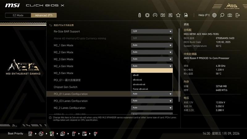 第一条pcie插槽支持x8+x8、x8+x4+x4、x4+x4+x4+x4三种拆分方式。