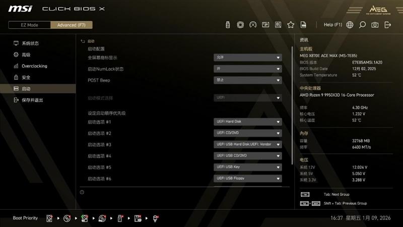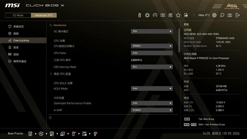 全新的click bios x图形化uefi,比起前代不论是布局还是界面都有了很大改变。