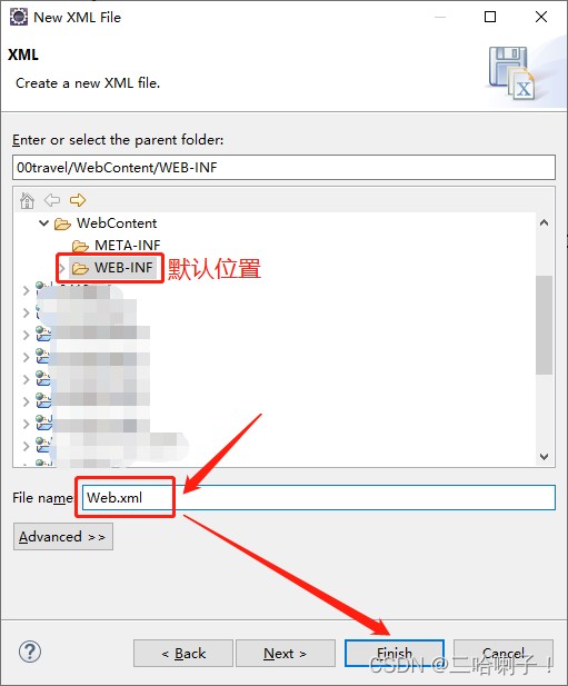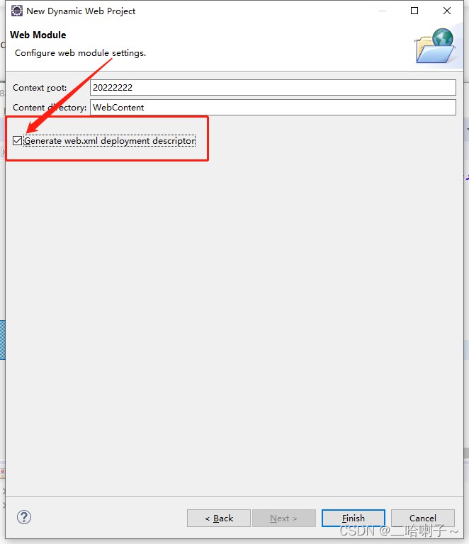 创建web项目时,一直点 next,不要直接点 finish,直到出现下面界面,选取画圈部分即可自动生成 web.xml