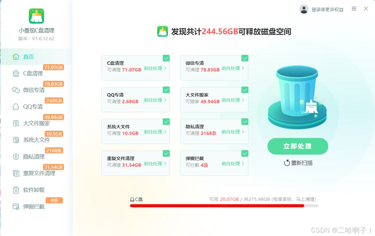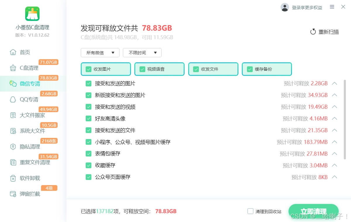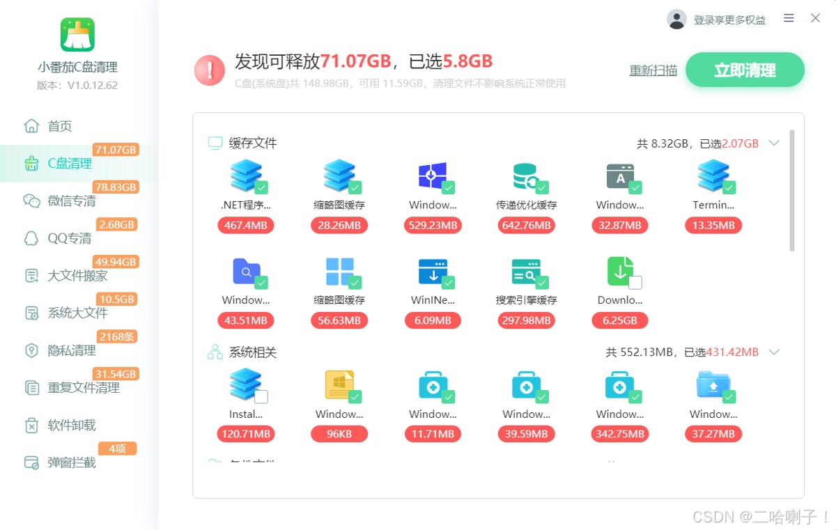 小番茄这款软件支持全盘清理,扫描分类很全面,操作都是一键式的,电脑清理不太熟悉的,推荐使用,简单!省事!重点是清理风险低,不会误删数据。