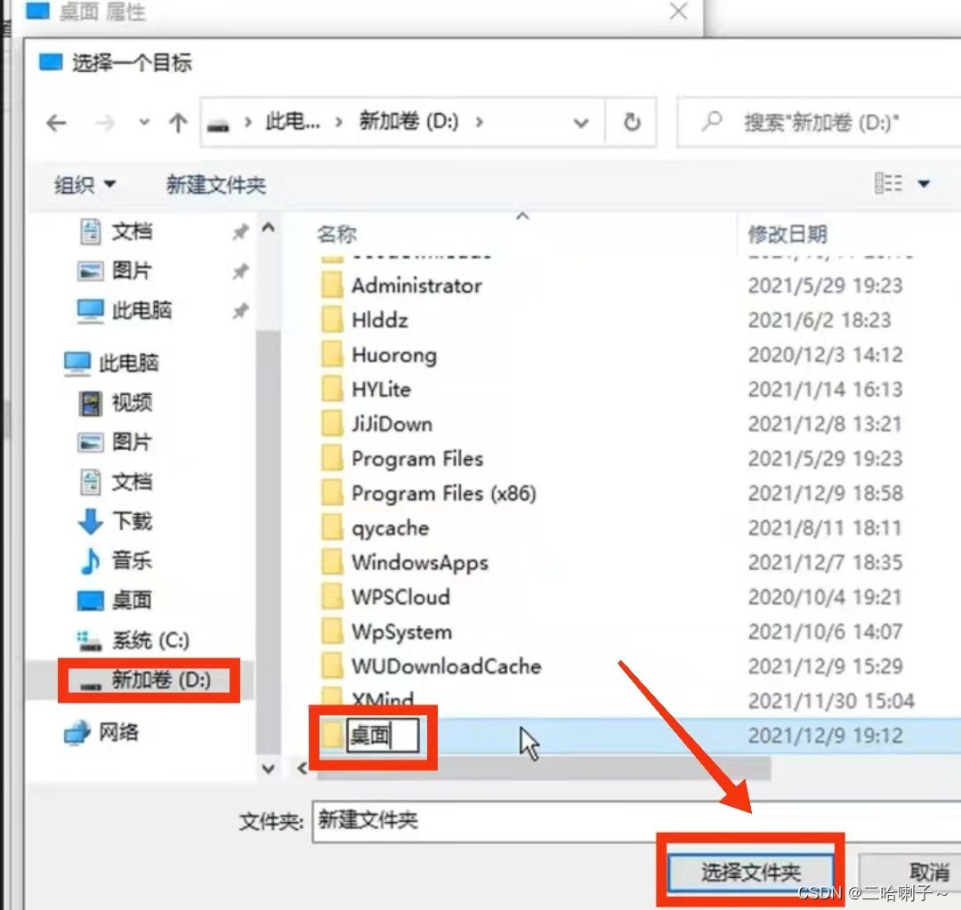 找到其他盘符,然后新建一个文件夹,命名为桌面,然后右下角点击【选择文件夹】