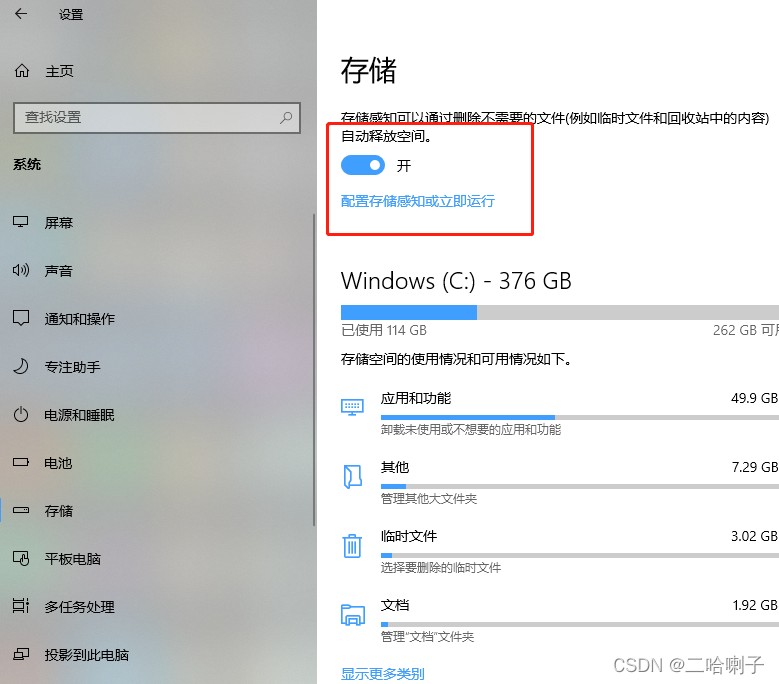 打开存储感知,让电脑自己定期清理垃圾文件