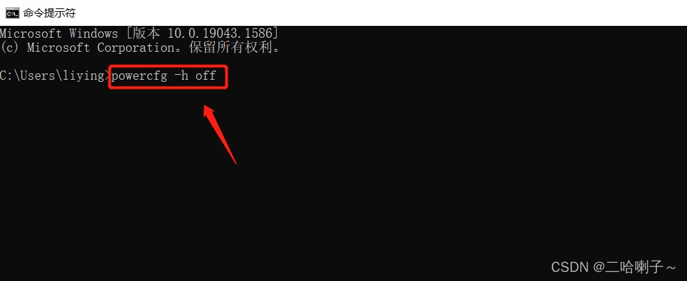 输入powercfg -h off,并按下【回车键】,如果没有出现报错信息,重启计算机就可以清除了