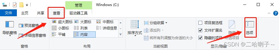 首先打开桌面“此电脑”,打开c盘,点击顶部菜单的查看,然后点击选项