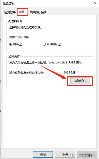 在弹出的对话框中再点击高级选项卡,然后再点击下方的更改