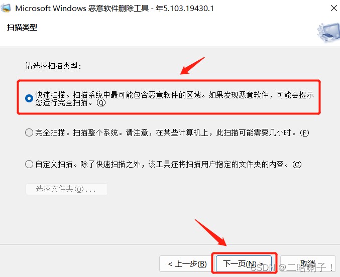 选择【快速扫描】(任意三个选一其实也行,根据自己需要)。然后选择【下一页】