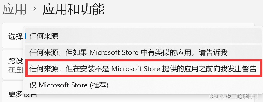 将任何来源修改为:任何来源,但在安装不是 microsoft store提供的应用之前向我发出警告