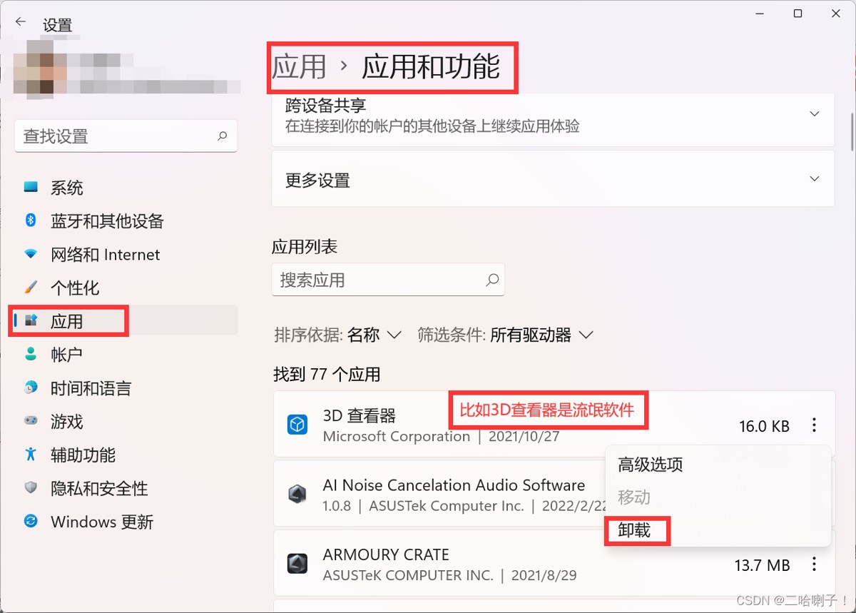 然后用电脑应用功能卸载流氓软件【这里是假如3d查看器是流氓软件!!!假如、打比方的意思!!!】