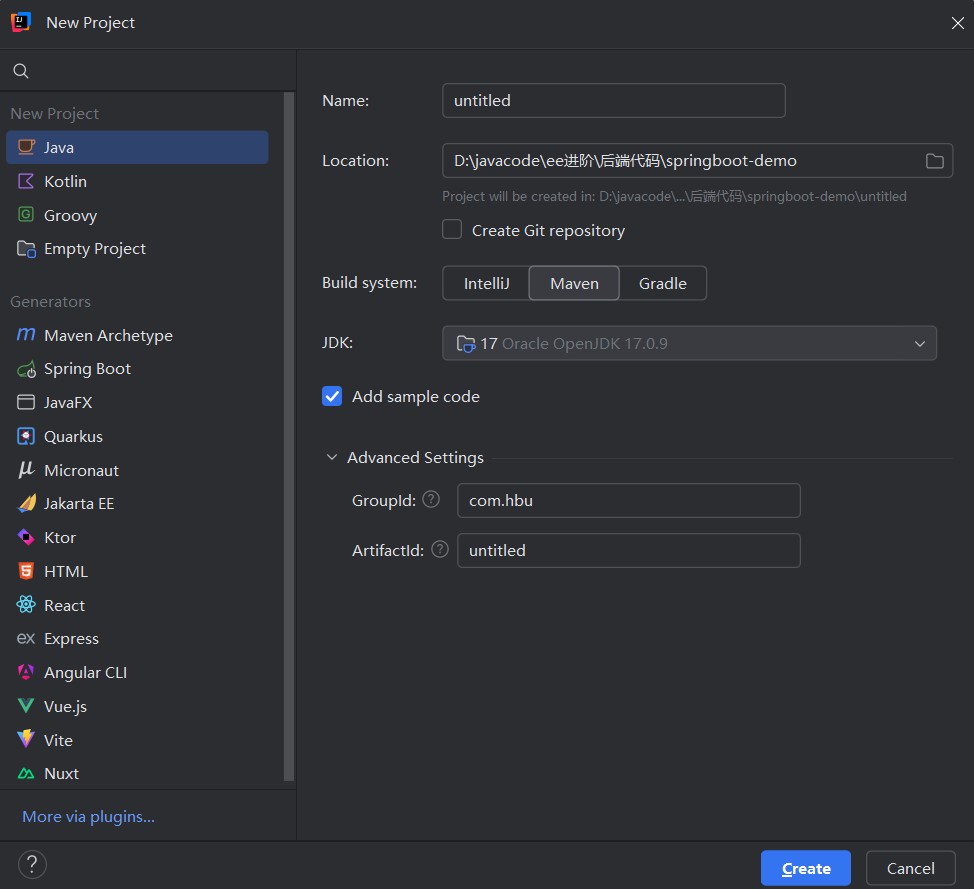 单单创建一个maven项目其实很简单,只需要在原有的基础上把本来创建的idea项目改成maven就好了。此处的groupid和artifactid在工作中参与大项目时会使用到,表示组名和项目的一些信息。
