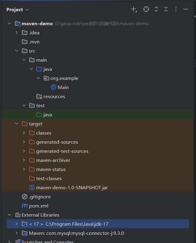 - target:maven构建项目后生成的输出目录,所有的编译、打包的结果都会在这里