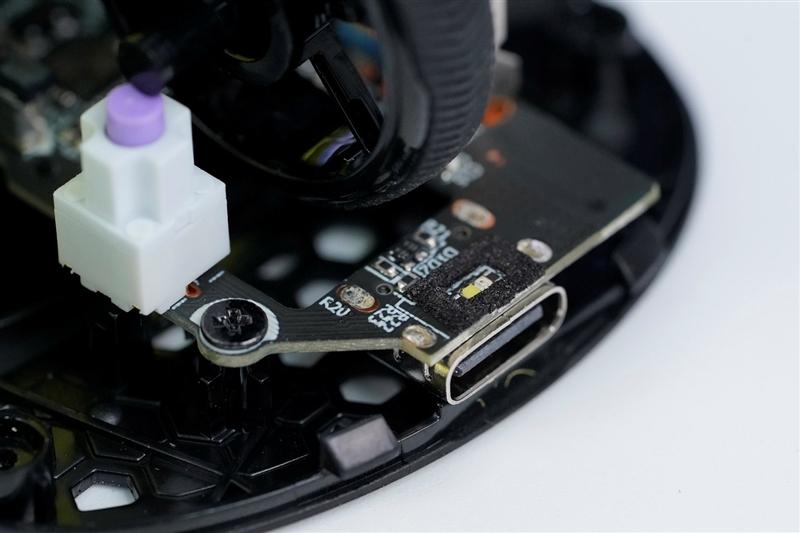 有线链接和充电使用的usb type-c接口特写,接口上方有两个微型led灯珠,用来指示鼠标的充电状态。