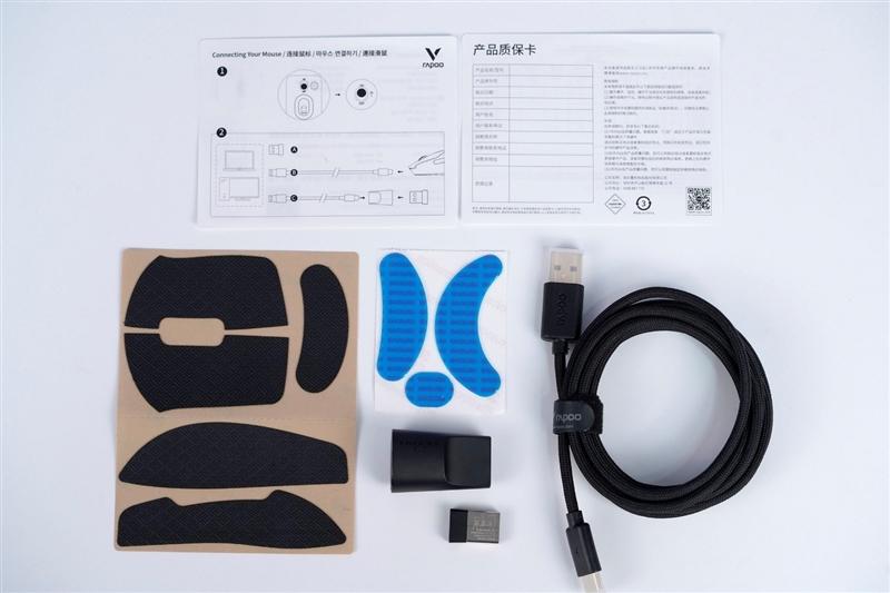 雷柏vt3s max的配件一览,除了简易说明书和保修卡之外,还提供了一组备用贴脚和一组防滑贴,一根编制线合萼一个接收器转换头。