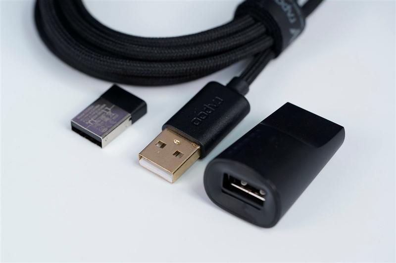 抗干扰编织延长线长度约1.8米,两端接头都做了镀金处理,可以给鼠标充电或者直接有线使用,也可以做延长线将接收器从主机后面移动到桌面上。