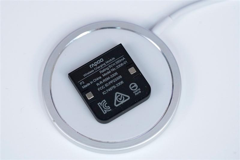 雷柏p3无线充电套件包装简洁,充电套件可以直接替换鼠标底部的磁吸盖板,使用符合qi标准的手机无线充电器就可以直接对鼠标进行充电。