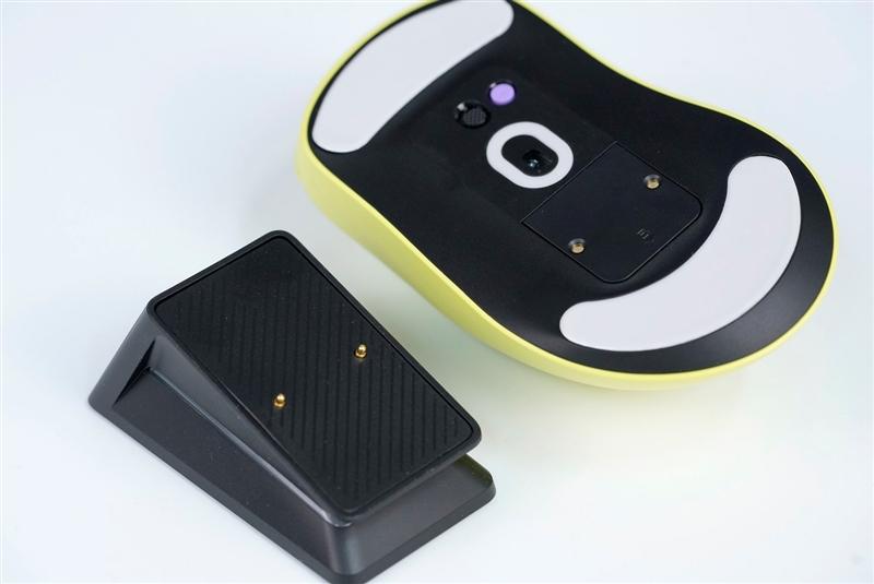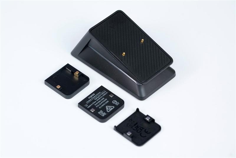 雷柏p5充电底座套装,其中包含一个底座和一个替换鼠标底部盖板的磁吸触点。