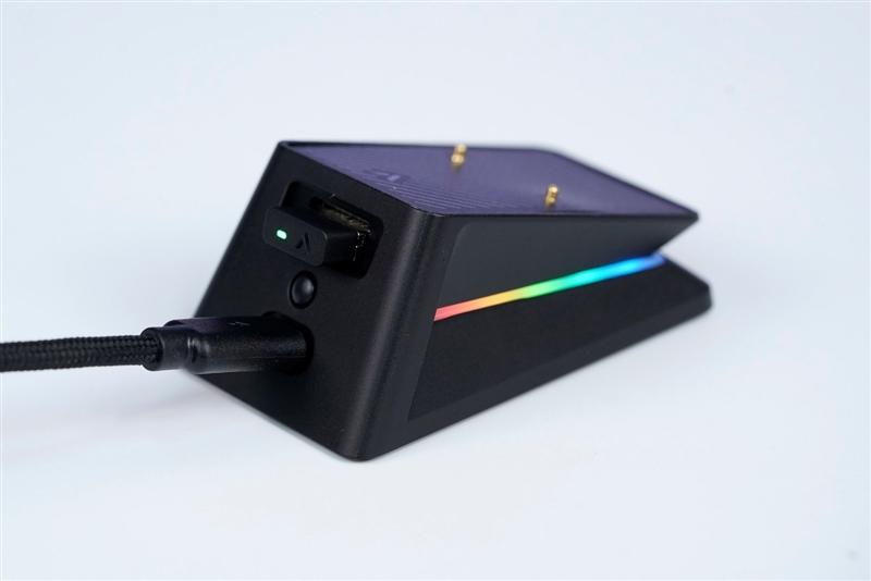 雷柏p5充电底座除了充电之外,还是一个接收器延长插座,放在桌面上还可以让鼠标和接收器距离更新,抗干扰性能更强,同时p5充电底座还自带rgb灯带,充电时会自动亮起,也是一个很好看的桌搭。