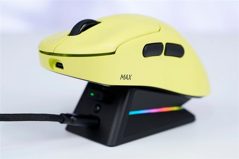 替换鼠标底部的磁吸盖板之后,雷柏vt3s max就可以直接放在p5充电底座上充电了,鼠标和底座之间也有磁吸辅助定位,轻放上去就会自动吸附上去完成定位。