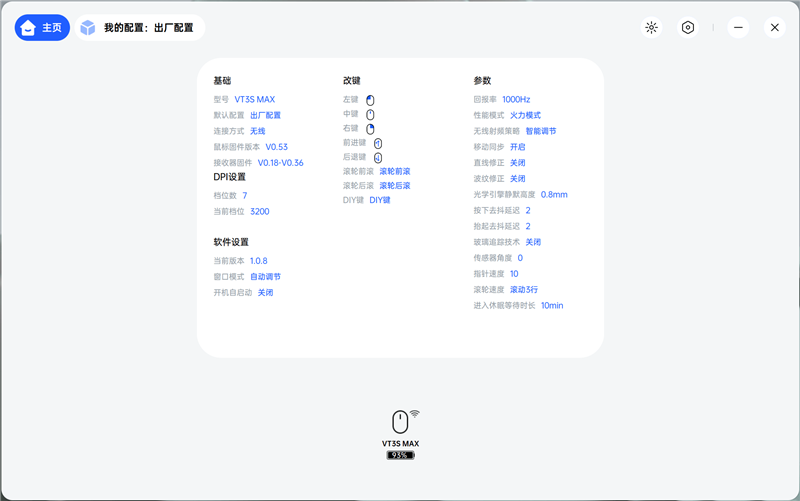 我们首先将雷柏的a-hub软件升级到最新的1.0.8版本,这样就可以顺利识别最新的vt3s max鼠标。
