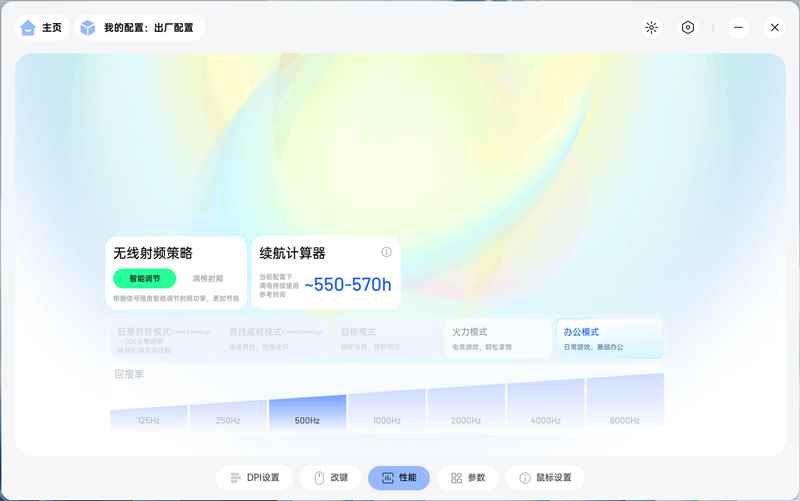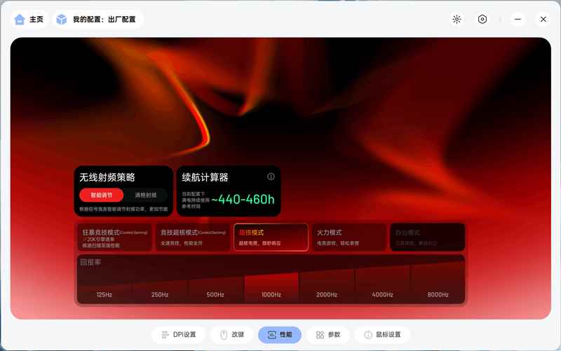 性能页面中可以调整鼠标的传感器扫描速度和通讯回报速度,提供了多种组合,合适从办公到极限电竞游戏场景,在不同场景下a-hub还会自动计算鼠标电池续航,方便玩家根据自己的需要进行调整设置。