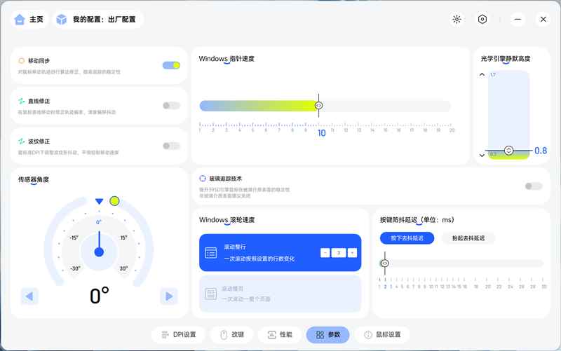 在a-hub的鼠标参数设置页面,雷柏vt3s max可以进行大量细致的参数调整,诸如传感器角度、光学引擎静默高度、按键防抖延迟等等,都可以根据使用习惯进行精细的调节,让鼠标更加顺手。